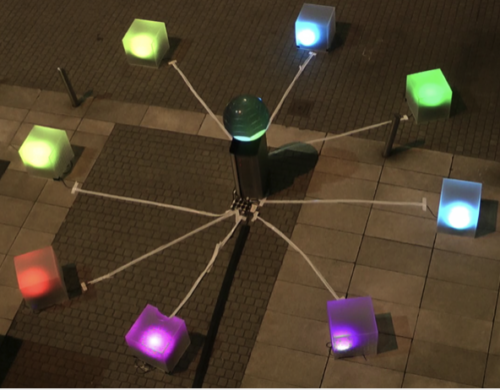 Tijdens het onderzoek bij deze topic ben ik “Enter the Circle” tegengekomen. Dit is een Playful Interaction voor openbare ruimtes, gemaakt door de Universiteit van Glasgow in samenwerking met Pufferfish Ltd in Edinburgh. Het is een bolvormige installatie waarbij het display touch sensitive is en er acht interactieve boxen gevuld met licht zijn. Het display is omgeven door een ring met die acht boxen. Voorbijgangers moeten de cirkel betreden om het display aan te raken om vervolgens het interactieve deel van de installatie mee te maken. De makers hebben deze installatie geplaatst om te zien hoe voorbijgangers omgaan met een onbekende interface in een openbare ruimte. Op de afbeeldingen hieronder zie je hoe het eruit ziet.